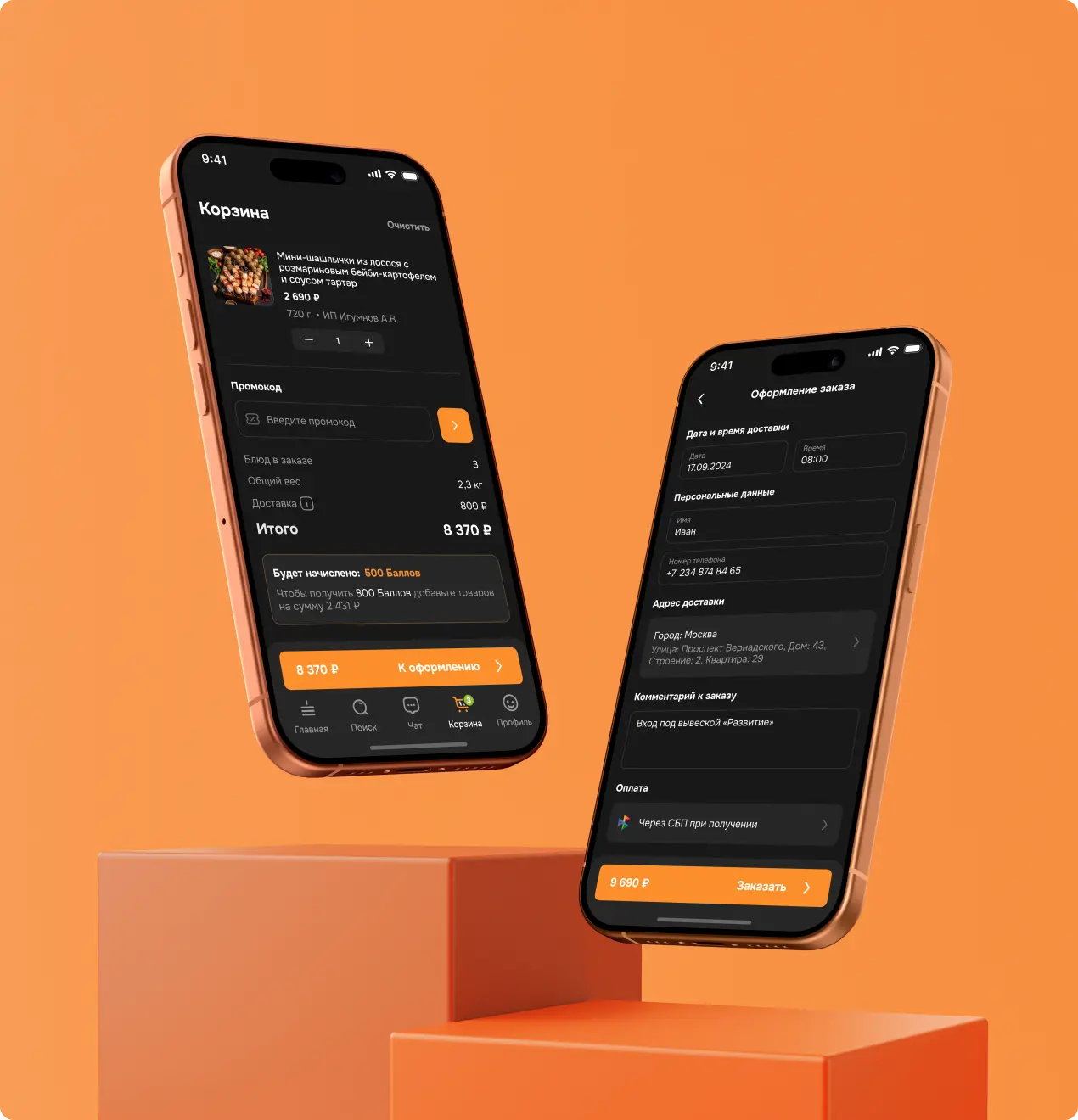 Пользователи могут одним кликом добавлять выбранные блюда и напитки в корзину, управлять количеством и просматривать детали заказа до того, как он будет оформлен. Мы усовершенствовали процесс оформления заказа, добавили возможность списывать баллы и применять промокоды.