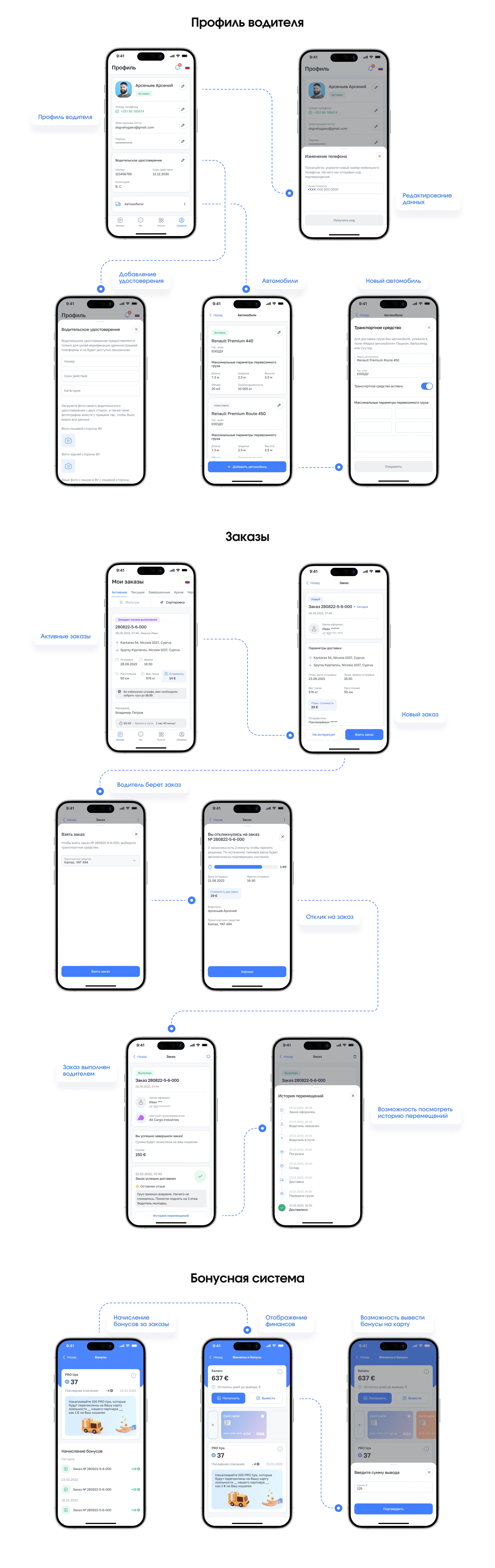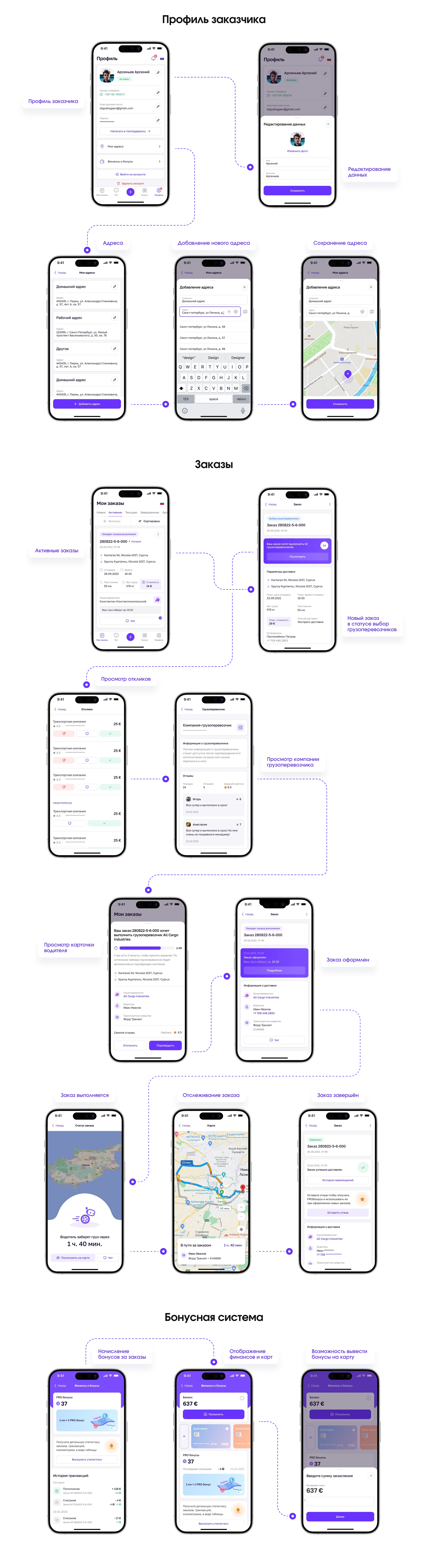 - Разработать: путь пользователя от заявки до доставки
